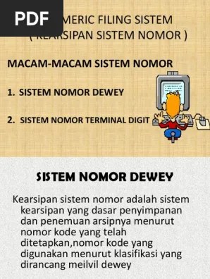 Contoh daftar klasifikasi nomor dewey:. Ada tiga lajur dalam daftar klasifikasi nomor ini. Sistem penyimpanan arsip atau warkat adalah suatu proses kegiatan atau proses. Filing system nomor terminal digit adalah system kearsipan yang memakai nomor . Ada tiga lajur dalam daftar klasifikasi nomor ini.